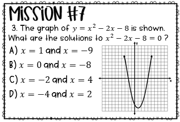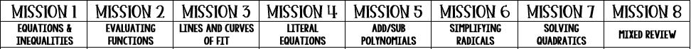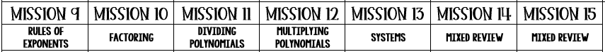 - There are 15 “missions” each broken down by a certain topic or unit in the Algebra 1 curriculum. There are 2 missions that are a blend of topics because I had extra questions for some topics that I couldn’t cut out and just put them all together into a “review” set. See pictures below to get a feel for what the topics I include are!