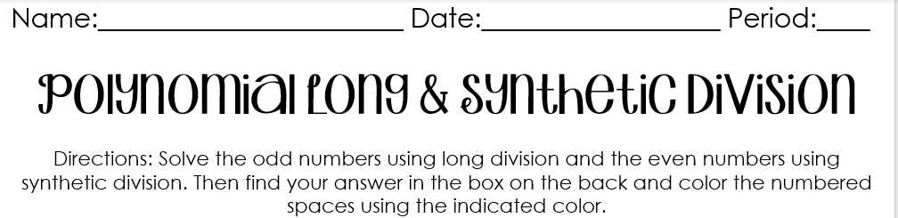 Directions: Solve the odd numbers using long division and the even numbers using synthetic division (the math part- changes depending on what topic it is and how I want students to solve the problems). Then find your answer in the box on the back and color the numbered spaces using the indicated color (the how to color part-doesn’t change).