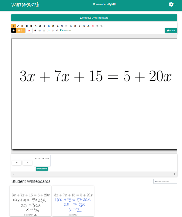 4. whiteboard.chat Admittedly, I have not used this one in my own classroom. I heard about this from one of my coworkers and it sounds a lot like whiteboard.fi. I believe one thing that can be done on whiteboard.chat that cannot be done on whiteboard.fi is that you can upload a PDF and assign “booklets” to students of multiple PDF pages that they can work through. This one also allows for polls to be taken from students. This one also requires that the teacher signs up for a free account, however, students do not need to sign in or create accounts, just join using the classroom code you create, similar to whiteboard.fi. There seems to be a few more options for what you can do on whiteboard.chat but no option for adding in math equation (but you can upload a PDF of problems) and it does have a steeper learning curve that whiteboard.fi.