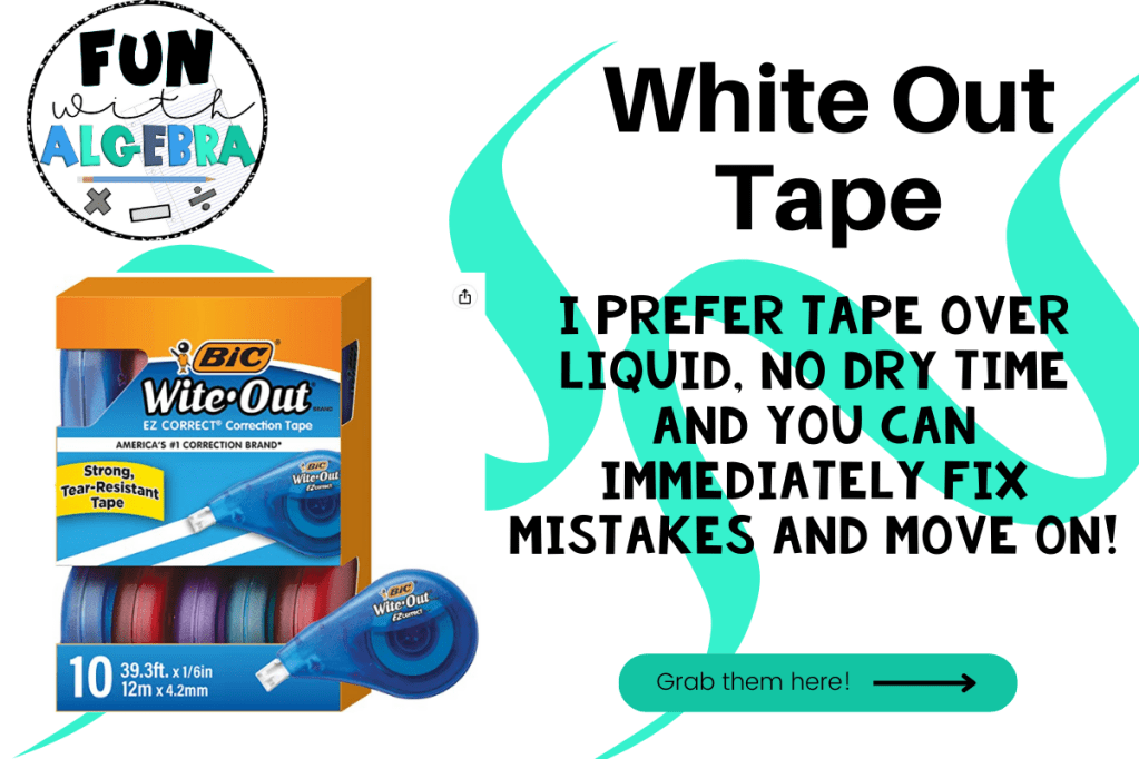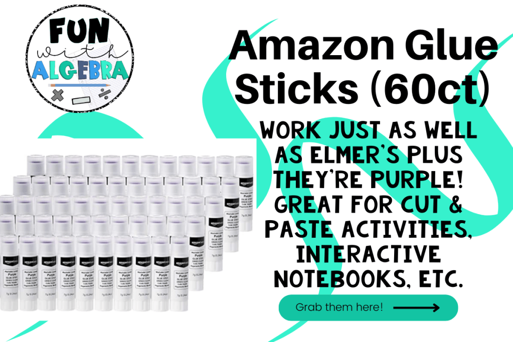 So many uses for sticky notes. The ones I have linked here are not actual post-its but they work just as well. I use them to write down steps to show students that they can copy onto their papers, quick problems, bookmarks, to do lists, reminders, the list is endless!