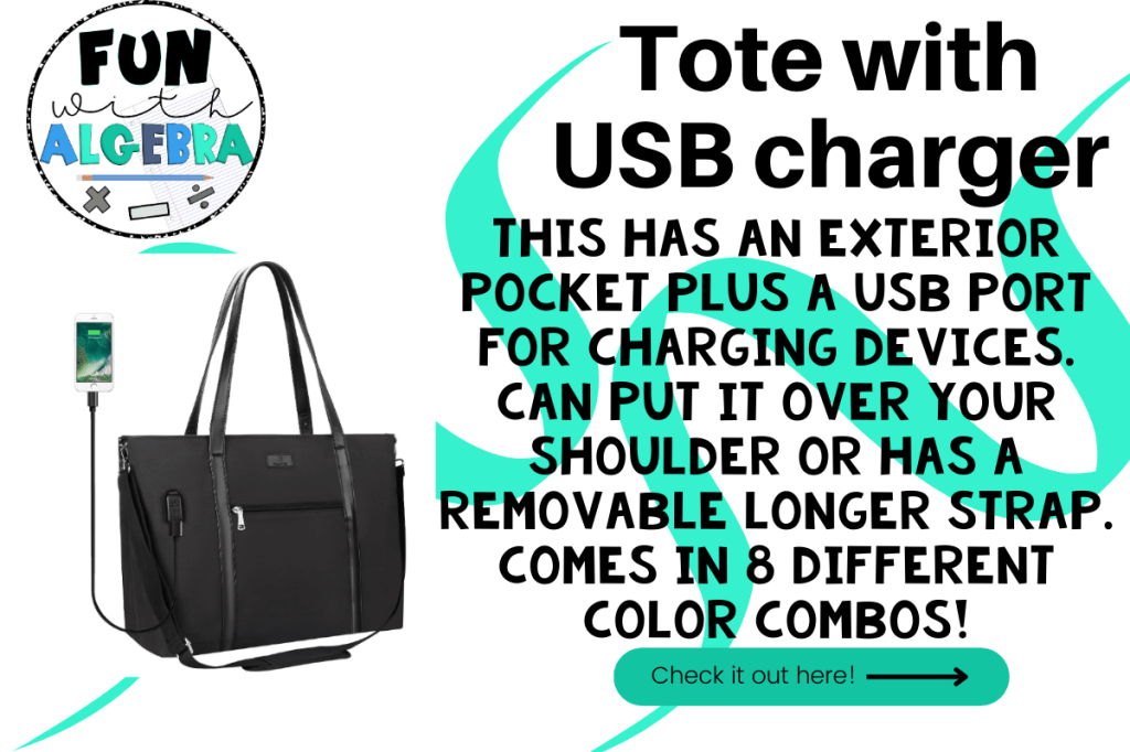 Love this one for the 8 different color combos- so you can get whatever color goes best with your teacher wardrobe to make you feel stylish! Plus it has a USB charging port that you can charge your phone and keep it safe from prying student hands and have it still be in your bag while charging!